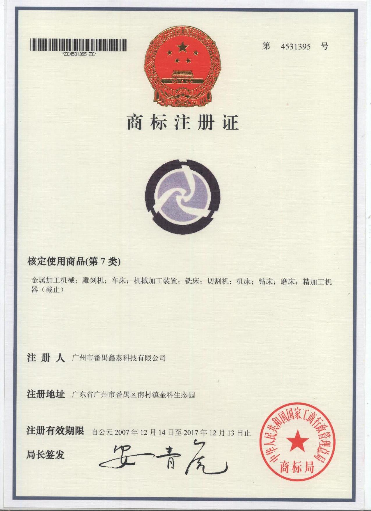 經過公司員工的辛勤努力,報國家商標局批準,廣東鑫泰科技集團喜獲第4531395號商標的商標注冊證