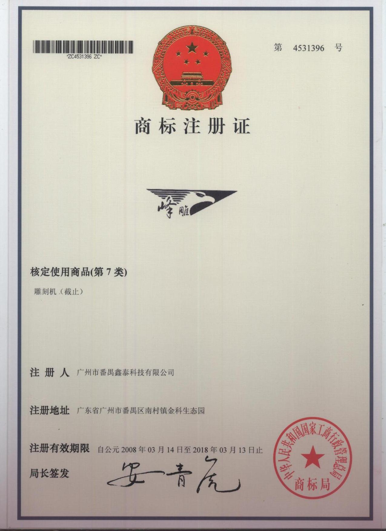 經(jīng)過公司員工的辛勤努力,報國家商標(biāo)局批準(zhǔn),廣東鑫泰科技集團(tuán)喜獲第4531395號商標(biāo)的商標(biāo)注冊證