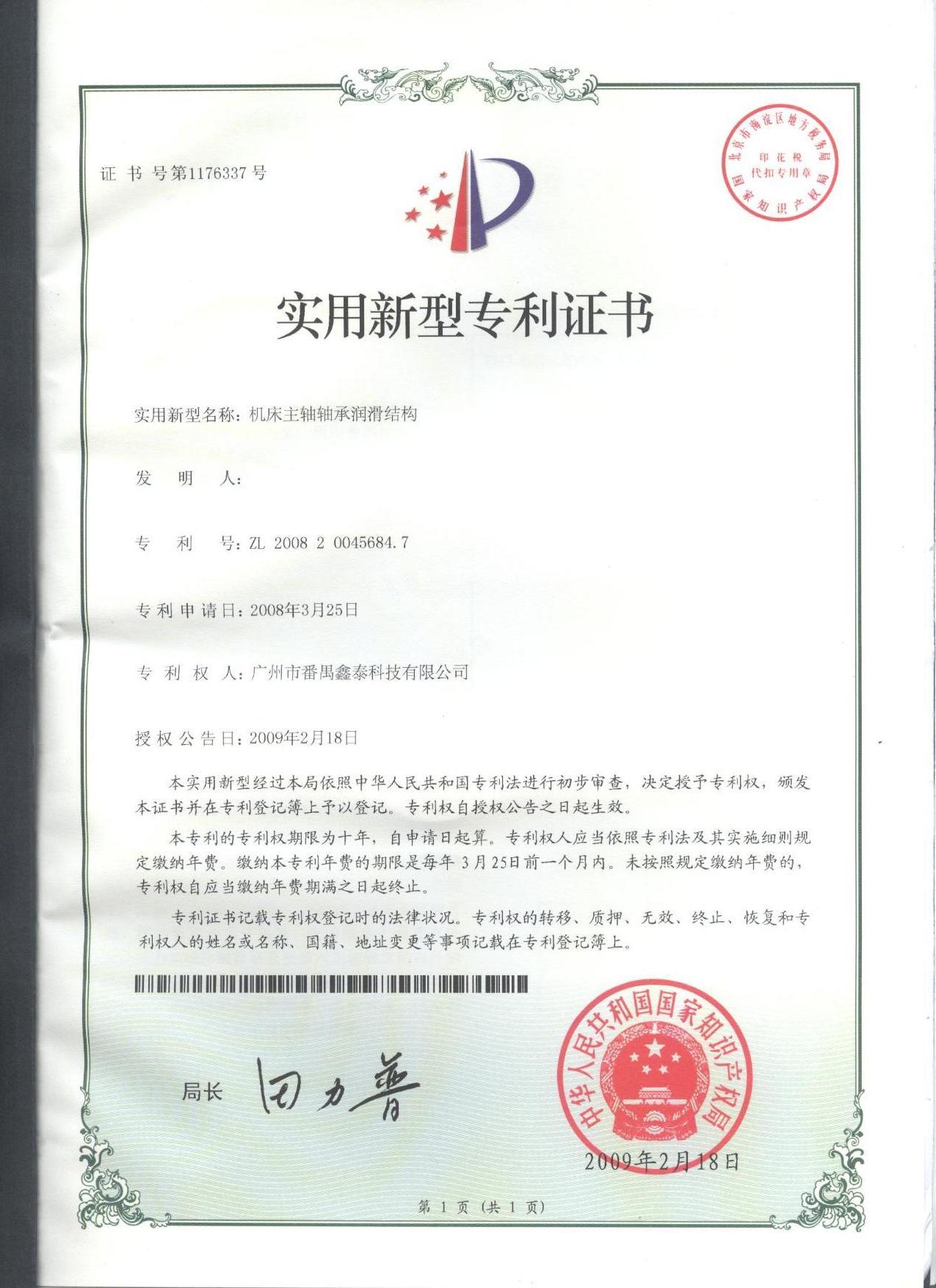經過公司技術部門員工的辛勤努力,鑫泰集團獲得“機床主軸軸承潤滑結構”的實用新型專利